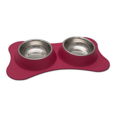 Comedero doble loving pets su base es en Caucho, es estético, fácil de limpiar, insonora y protege el piso de rasguños